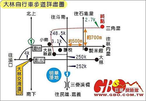 溪口鄉自行車道便讓人可惜,有完整立牌也種了小樹木,但在筆直的車道後卻找不到連接點,施工告示上說明原本96年就該完工,現在已97年,是否已經算完工還是讓人摸不著頭緒?而大林鎮的三角蔗埕自行車道,其實以一般水準來說算不錯了,但起點的標示並不清楚,離大林糖廠這明顯地標仍有一段距離,要讓第一次探尋的人馬上找到,似乎還有一定的困難點。