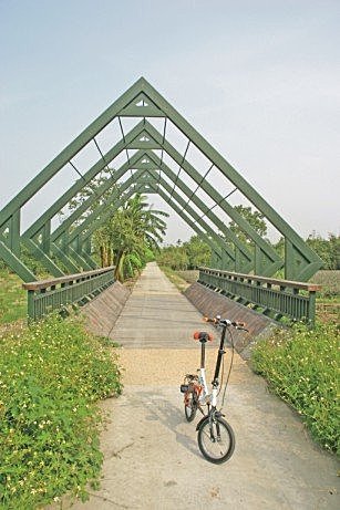 應該是看過太多風景、太多自行車道,巨報探險隊在欣賞事物的層級上總是與一般讀者不同,來到大林鎮的三角蔗埕自行車道,先姑且不論這個自行車道的起點是多麼隱密在鄉間小道裡,其實它就跟一般鄉鎮村里現正拓建的自行車道沒什麼兩樣,閒靜的鄉村風光,綠油油的稻田大樹,田野中的小房小舍,筆直的車道種滿美麗花草,其間再添加上一些有趣的小裝飾,這樣的條件,看起來就足以構成一個令人感到輕鬆自在的親子自行車道。