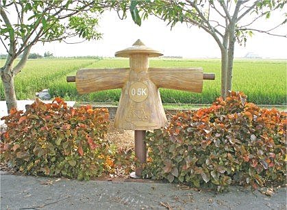 可愛的木頭稻草人,清楚地標示著自行車道的公里數,相襯著一旁的稻田還真是有夠搭。