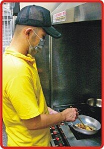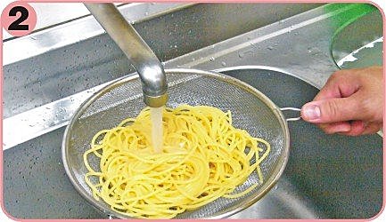 2、約煮6分半鐘將水瀝掉後,可微沖冷水增加麵條彈性