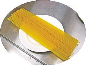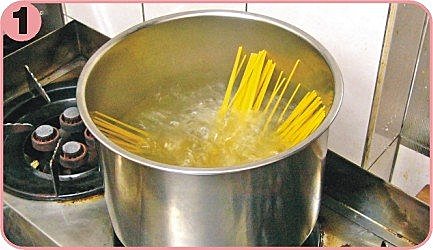 1、將麵條放入已加了少許鹽巴及橄欖油的滾水中,且每隔一陣子要稍作攪拌,避免黏鍋