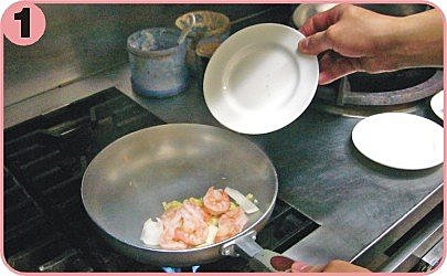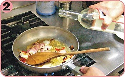 1、倒入些許橄欖油,放入蒜頭、洋蔥及蝦仁後,加進白酒稍微拌炒