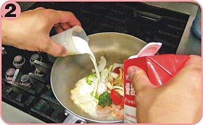 2、放入蔬菜後,加進牛奶及鮮奶油稍微拌炒