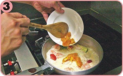 牛奶及鮮奶油各100cc、鹽巴一小匙、高湯粉少量、適量橄欖油及白酒、巴西里香料少許