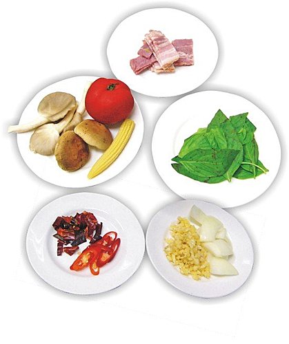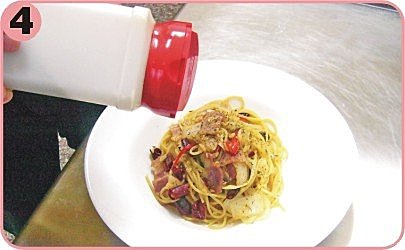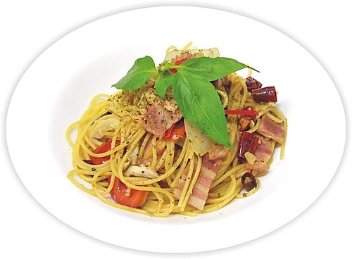 培根適量、煮熟義大利麵條70克、羅勒葉7至8片、香菇及番茄等蔬菜適量(可依喜好變換)、少許蒜頭、乾辣椒、辣椒、洋蔥丁