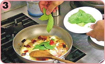 3、放進蔬菜、羅勒葉稍微拌炒,再下麵炒至鍋內湯汁微乾