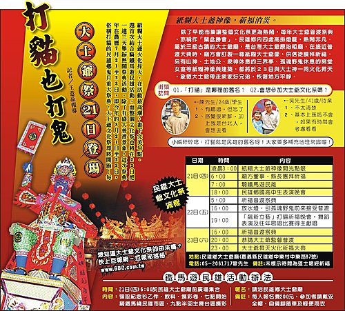 俗稱打貓的民雄鄉鬼月重大祭典-大士爺文化祭即將開跑!每年在農曆7月21至23日,即今年的8月21日至23日,一連三天舉辦熱鬧祭典活動。除了有盛大普渡景象,這次祭典還首次結合騎鐵馬遊民雄活動,而整個文化祭也將在23日把紙糊大士爺火化昇天,在活動最高潮,畫下完美句點。