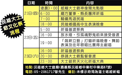 時間:21日(四)6:00於民雄大士爺廟前廣場集合