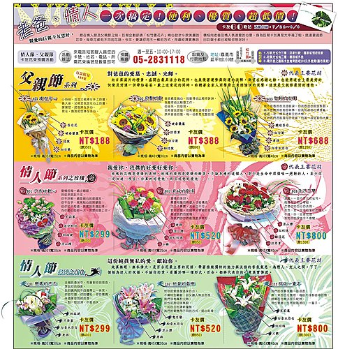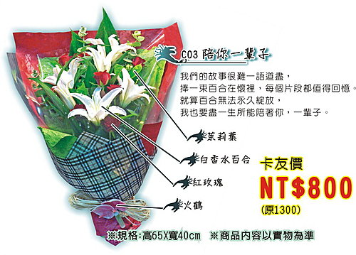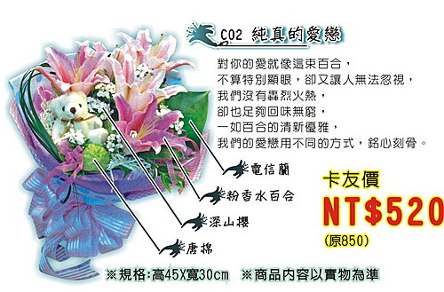 活動辦法:來電告知客服人員您的卡號、姓名、電話、所需花束編號及數量即可