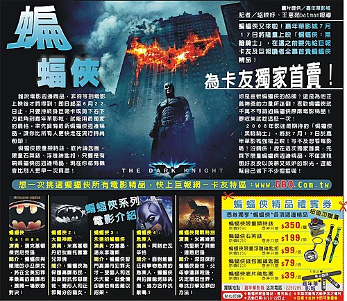 被喻為2008年影迷最期待的「蝙蝠俠:黑暗騎士」,即將在7月17日於嘉年華影城強檔上映!等不及想看電影嗎?沒關係!趁著這次獨家首賣,先買下限量蝙蝠俠週邊精品,讓你的親朋好友投以羨慕又嫉妒的眼光,還能幫自己省下不少摳摳喔!
