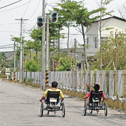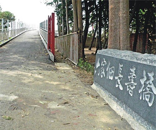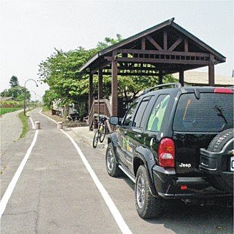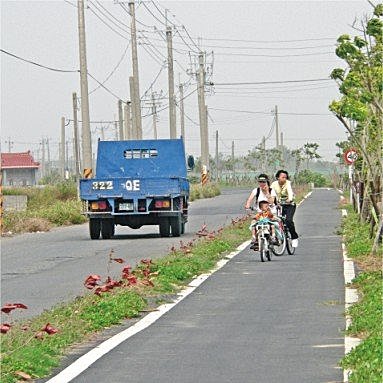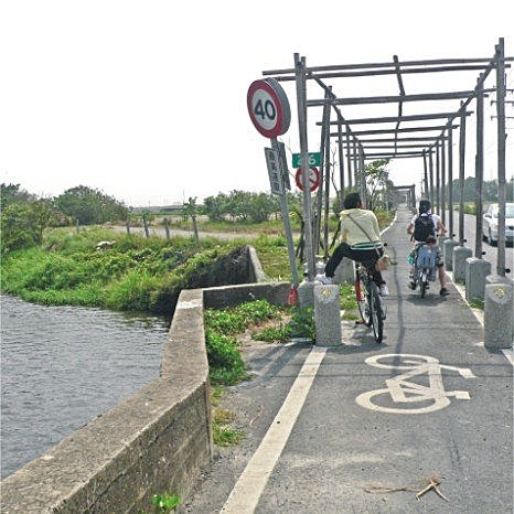 自行車道入口的竹門真是讓人嚇一大跳!強勁的風勢吹過竹子間的裂縫,產生出尖銳刺耳的聲音,連小編也忍不住大叫:「哇!好多鬼的聲音喔!」真的很像在拍鬼片嘛,破損不堪的竹門加上可怕的聲音,怎麼會不像呢?這段自行車道還包含一些潛在危險性,一旁呼嘯而過的汽車、砂石車只靠一條白線區隔,不僅沒有任何遮避物,也沒有看到一盞路燈,對騎過許多自行車道的小編來說,這樣的自行車道還不算及格呢!