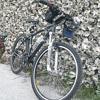 進入海邊的地形,隨處可見大量被串起的蚵仔,不免俗地,自行車一定要跟這些蚵仔山合照一張呀!而且海上還有獨木伐一艘,是誰從荒島上逃出來的?