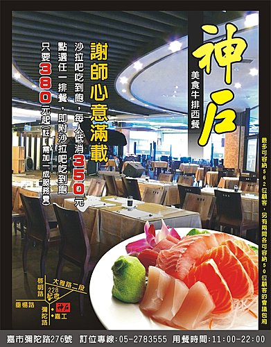 位於彌陀路上的神戶,於上個月開始增賣西餐!在漲聲不斷下,為讓更多人盡情享用店內美食,除了將吃到飽價格,從五百多調降為三百多,更推出各式精緻西餐,提供顧客另一種消費選擇。百樣美味料理及寬敞舒適的環境,是歡慶節日的好去處。