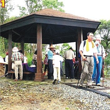 不算長的步道,在巨報探險隊隨意散步下,很快就到了山頂的涼亭,已經有山友早一步搶佔在裡頭休息,來看台南廖大哥有著十幾年的登山經驗,不急著趕行程的我們,在班長愛跟人聊天的個性使然下,問到了許多寶貴的資料,但最讓小編與阿福在一旁驚嘆的是,廖大哥他們帶的零食還真是多到令人傻眼吶!阿福還說他們一定有小叮嚐的口袋!小魚干、豆干條、糖果、蕃茄、沙拉,呼!足以讓小胃的探險隊吃個飽囉!