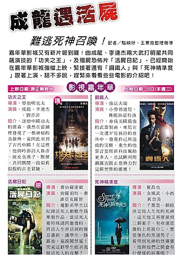 嘉年華影城又有新片報到囉!由成龍、李連杰兩大武打明星共同飆演技的「功夫之王」,及殭屍恐怖片「活屍日記」,已經開始在嘉年華影城強檔上映,緊接著還有「鋼鐵人」與「死神精準度」跟著上演,話不多說,趕緊來看看些些電影的介紹吧!