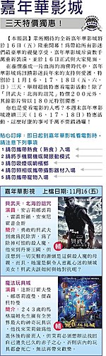 在漲價漲成一片血海的消費時代中,嘉年華影城為回饋影迷長年來的支持與愛護,特別於11月16、17、18日(五、六、日)三天,舉辦超值特惠看電影活動!除了「貝武夫:北海的詛咒」特價200元外,其餘影片皆以180元特別獨惠。
