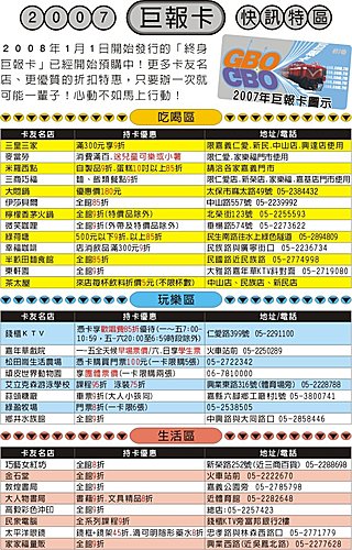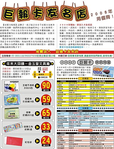 【巨報卡特報】這陣子,為了給2007巨報卡友更多年末回饋,我們與嘉義巿公教福利中心、金玉堂書局、綠盈牧場、口舍土也方等卡友名店合作許多獨惠活動,感謝各位卡友的愛護與支持!物價越是漲,巨報卡越要讓你省!