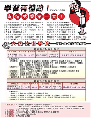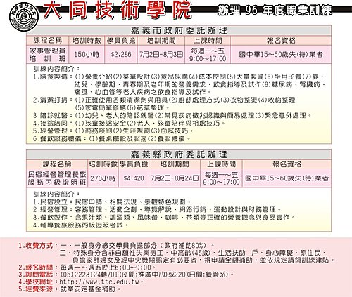 大同技術學院於7月起,開辦2班由縣巿政府補助的職業訓練課程「家事管理員培訓班」、「民宿經營管理餐旅服務丙級證照班」,只要你符合年滿15歲以下,60歲以下的失業(或待業)者條件,即可報名參加!