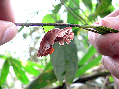 長尾麝鳳蝶的蛹,像貝殼被吊在樹枝上。