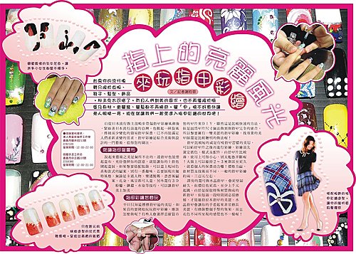 自從日本流行教主濱崎步帶領指甲彩繪風潮後,緊跟著日本流行前進的台灣,也掀起一陣旋風。傳統而少變化的簡易指甲保養,已不再能滿足人們求新求變的需求,指甲彩繪是綜合美術與設計的一門藝術,值得您的關注。