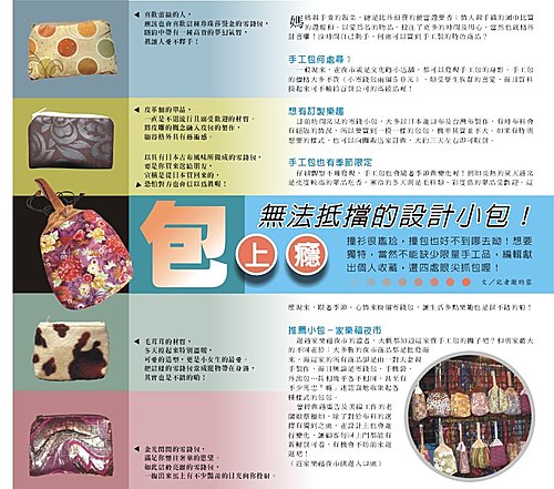 一般說來,在夜市或是文化路小店舖,都可以發現手工包的身影。手工包的價格大多不貴(小零錢包兩個50元),頗受學生族群的喜愛,而且質料摸起來可不輸給百貨公司的高級品喔!