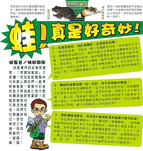 這個禮拜四巨報探險隊-「探險知識堂」又來囉!各位爸爸媽媽有沒有跟小朋友們一起準時看報紙!看看今天班長爸又要告訴大家什麼有關青蛙的常識呢?巨報探險隊可不是浪得虛名,我們不只是會玩而已,玩也要玩之有道,本月青蛙月!一起呱!呱!呱!