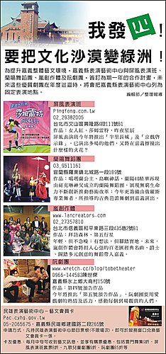 為提升嘉義整體藝文環境,並進一步帶動文化觀光產業的發展,嘉義縣表演藝術中心已與屏風表演班、蘭陽舞蹈團、嵐創作體及阮劇團,簽訂為期一年的合作計畫,未來這些優質劇團在年度巡迴時,將會把嘉義縣表演藝術中心 列為固定表演地點。