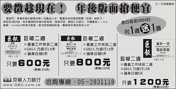 廠商們,準備年後大舉徵才嗎?在嘉找人才,靠最在地的資深媒體「巨報」就對了!即日至1月30日,快來電預約年後刊登版面,透過平面、網路人力銀行、手機最夯LINE動態、facebook等多元管道,強力放送職缺訊息,幫廠商年後找到好人才!