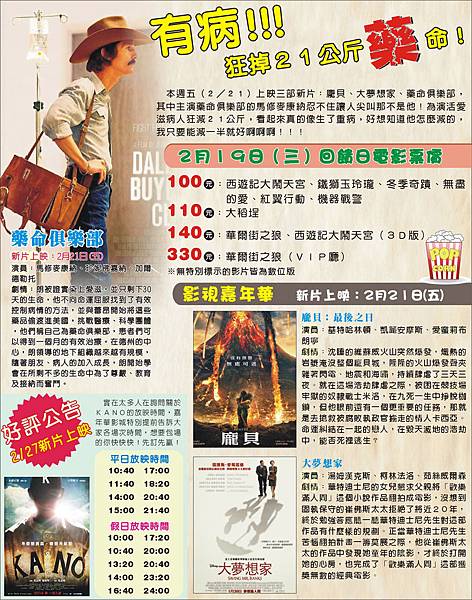 本週五(2/21)上映三部新片:龐貝、大夢想家、藥命俱樂部,其中主演藥命俱樂部的馬修麥康納忍不住讓人尖叫那不是他!為演活愛滋病人狂減21公斤,看起來真的像生了重病,好想知道他怎麼減的,我只要能減一半就好啊啊啊!!!!